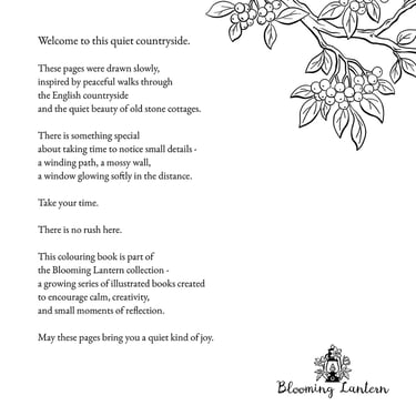 Inspired by the calm beauty of countryside walks, old stone cottages, blooming gardens, and the cozy spirit of hygge living, this colouring book celebrates the quiet charm of nature’s small details.