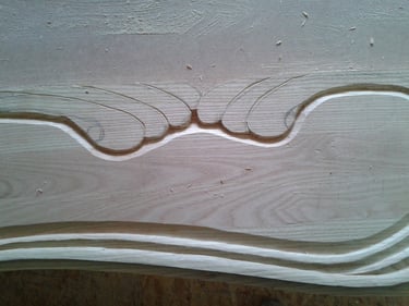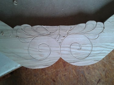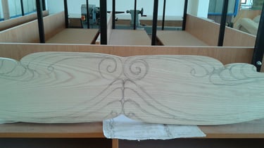King-sized bed's frame-decor carving. After I received the sawed-off and prepared wooden parts of the bed with a sketched pattern, I had to see in my head how it would look in reality. The client was very satisfied with the result.