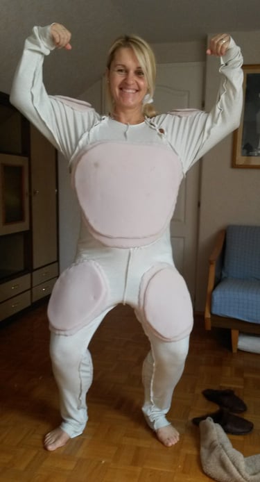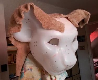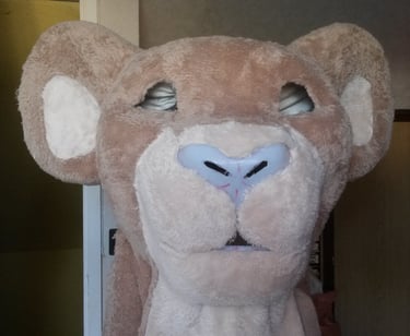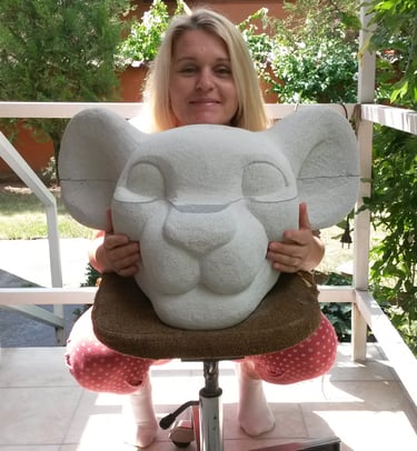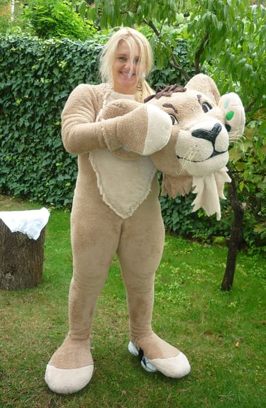 The task was to make a mascot to communicate the client's ideas to the children. So, I created this 'animal' by drawing as a character in a colouring book, and by 3D forming it as a costume. The head had to be sculpted first to cast the plastic head. Generous limb prosthetists assisted in the head making process. I did all the other work.